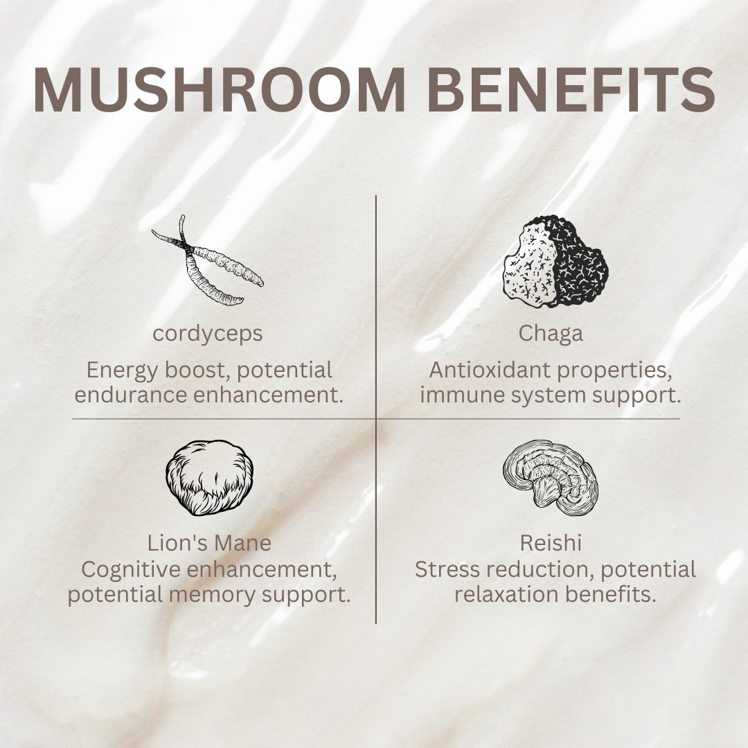 Mushroom Coffee blends often include a variety of mushrooms, each contributing its unique set of benefits: