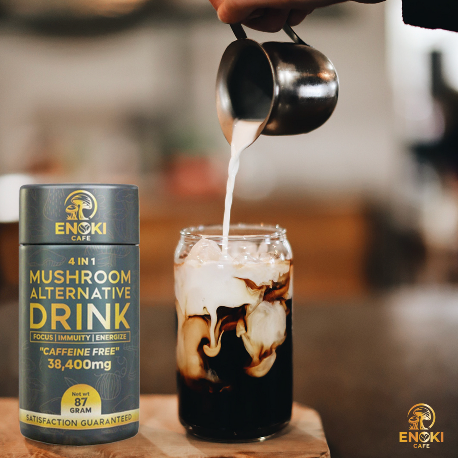 - - Pour the frothed milk over the brewed Mushroom Coffee.